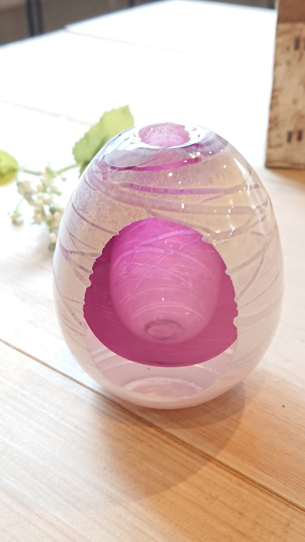 一番内側にピンク、そのまわりに透明なガラス、そのまた外側に白いガラスに透明のガラスで模様がつけてあります。一面カットをして磨いていくので、中のピンクがまるで浮いているように見えてきます(^-^)