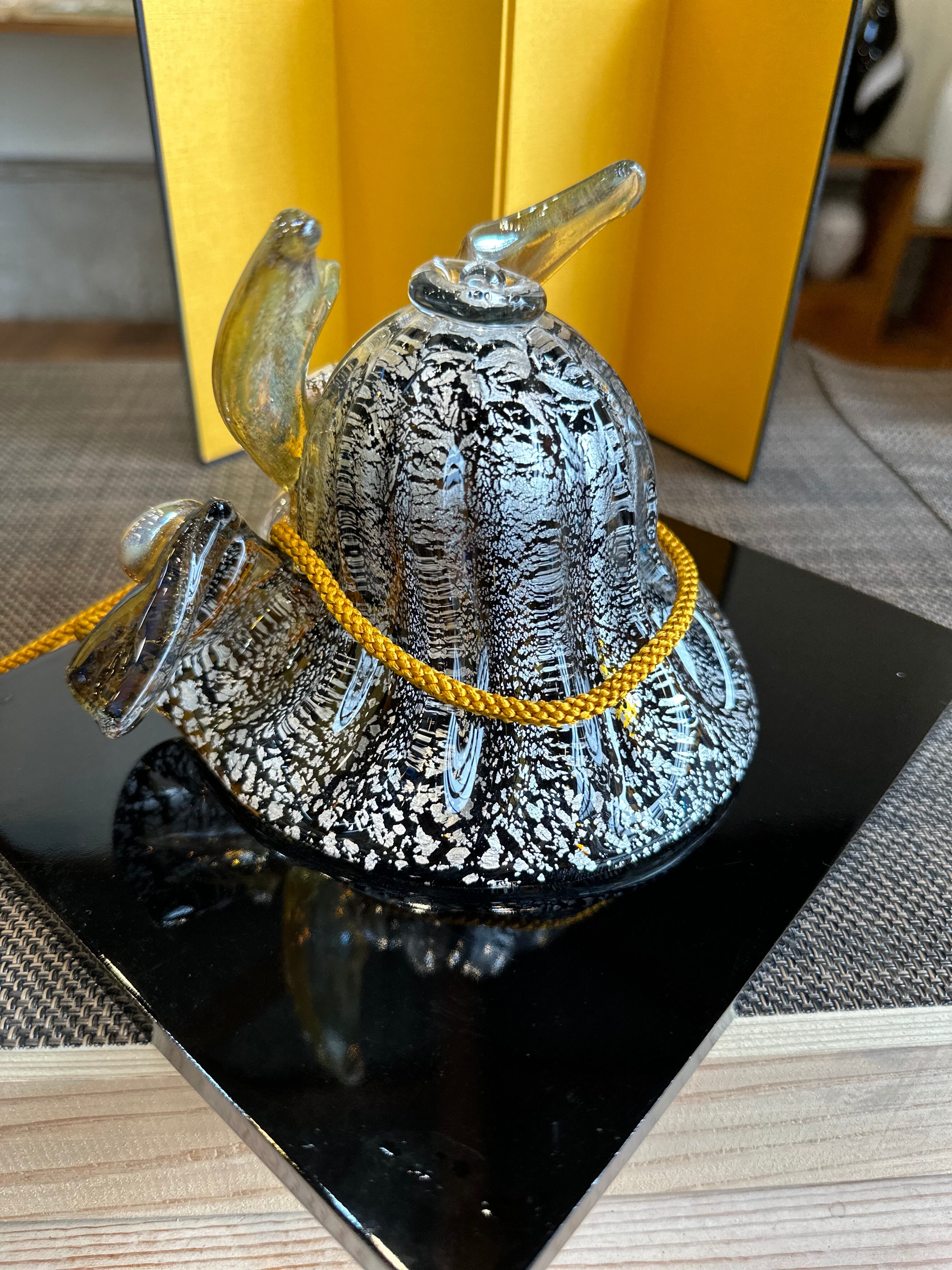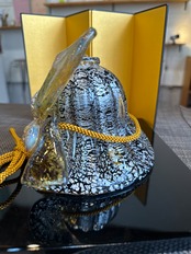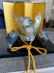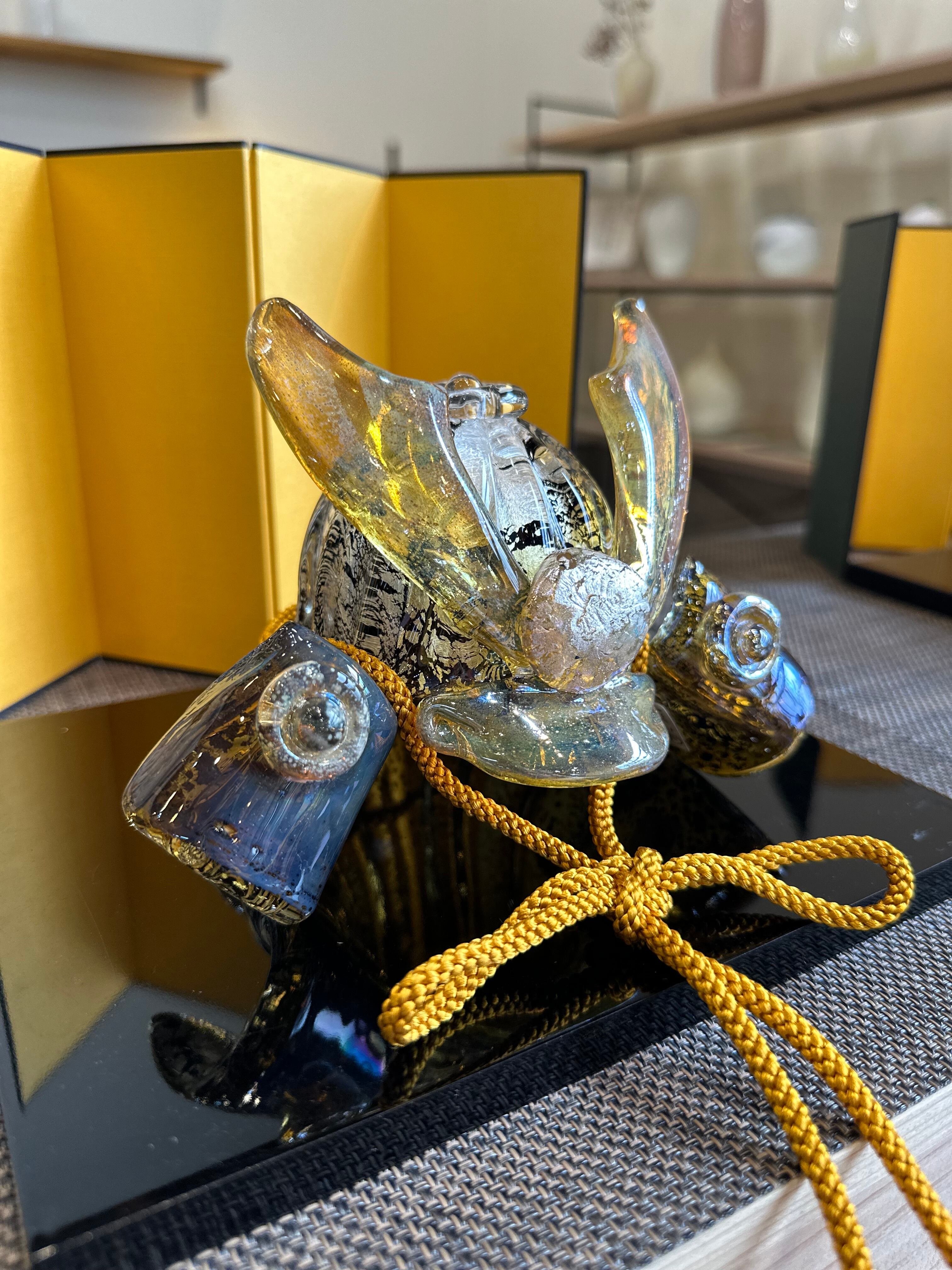 こちらの兜はトパーズ色に銀箔を散りばめて、ガラスを煌びやかに表現してある作品になります