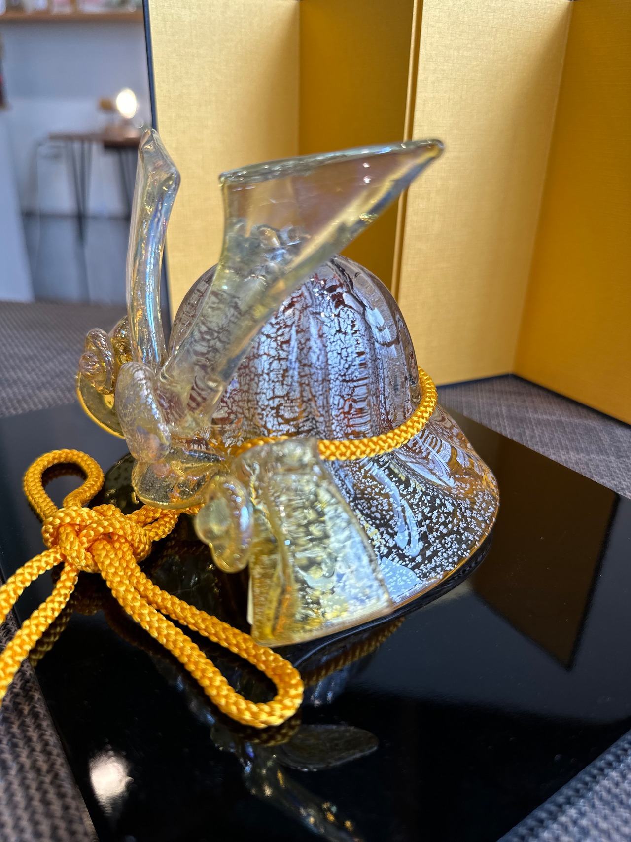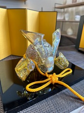 こちらの兜は黄色に銀箔を散りばめて、ガラスを煌びやかに表現してある作品になります