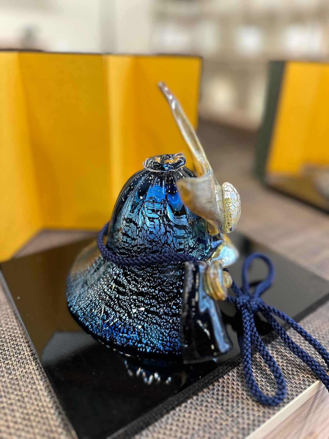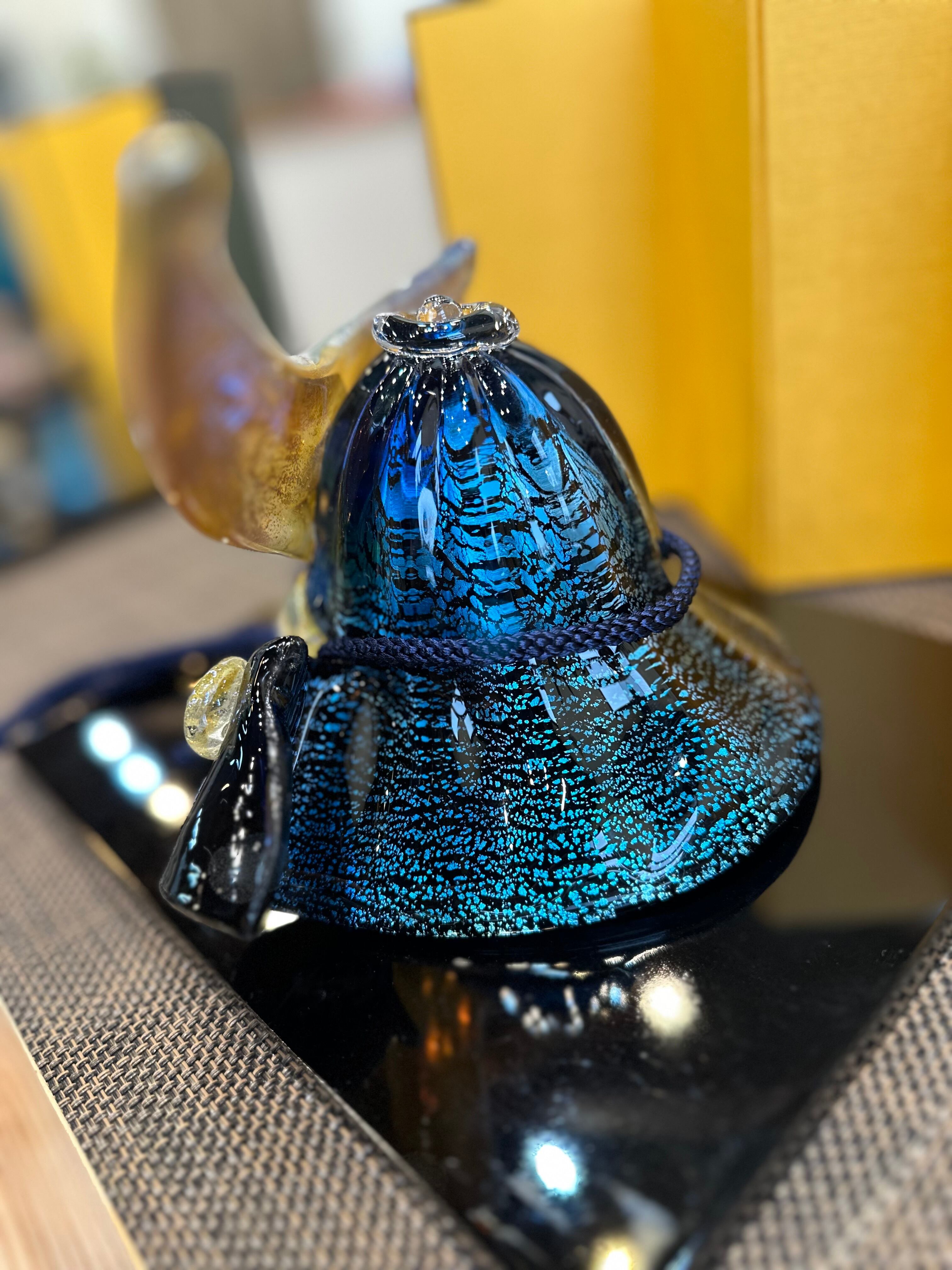 こちらの兜は黒色を内側に、上に青色、水色をのせ、銀箔を散りばめて、ガラスを煌びやかに表現してある作品になります
